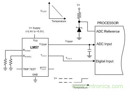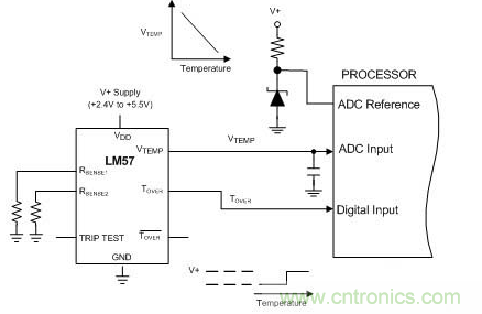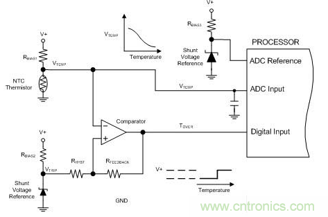 處理器的模數(shù)轉換器用于采集溫度模擬電壓(VTEMP)。當溫度超出臨界值時,過熱(TOVER)輸出端會驅動處理器的輸入端進行指示。跳脫點由兩個無源電阻器(RSENSE1和RSENSE2)設置,而不是由有效參考端和偏壓電阻器設置。