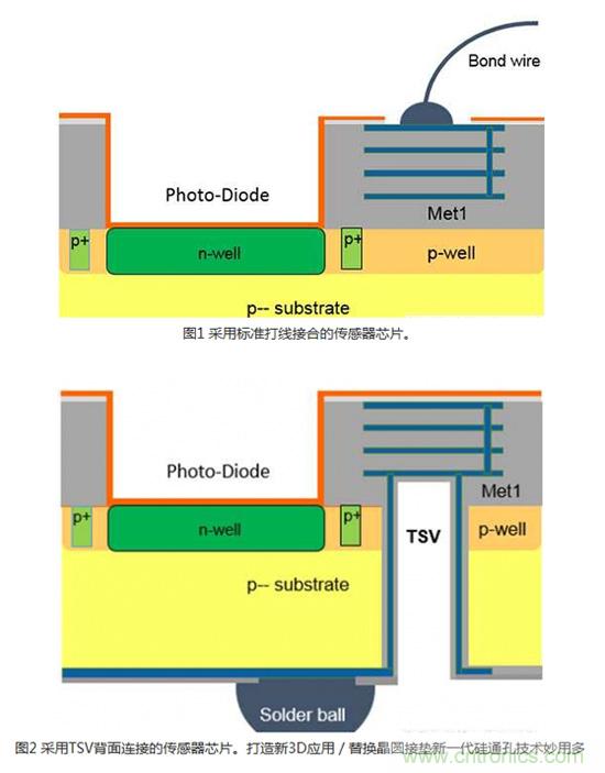 模擬3DIC技術通常是透過建造芯片正面到IC背面的電氣連接來實現(xiàn)傳感器應用。 在許多傳感器應用,例如光學、化學、氣體或壓力傳感器中,感測區(qū)域是位在CMOS側(cè)(晶圓的頂端)。 芯片和導線架之間最常用的連接是打線接合(Wire bonding)(圖1)。 無論是使用塑料封裝,或是將裸片直接接合在印刷電路(PCB)或軟性電路板上,對于某些會將感測區(qū)域暴露出來的應用而言,打線接合并非理想的解決方案。 采用專業(yè)晶圓代工業(yè)者的專有TSV技術,可以利用TSV、背面RDL和芯片級封裝(WLCSP)(圖2)來替代打線。
