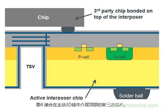 3DIC技術的另一個變化和極為創(chuàng)新的發(fā)展,是硅中介層架構(gòu)(Silicon interposer architecture)。 所謂的被動3D硅中介層是用來產(chǎn)生一個從芯片的頂端到底部的簡單電氣連接。 所謂的主動3D硅中介層能支持實現(xiàn)完整CMOS設計所需制程技術的所有被動和主動組件。