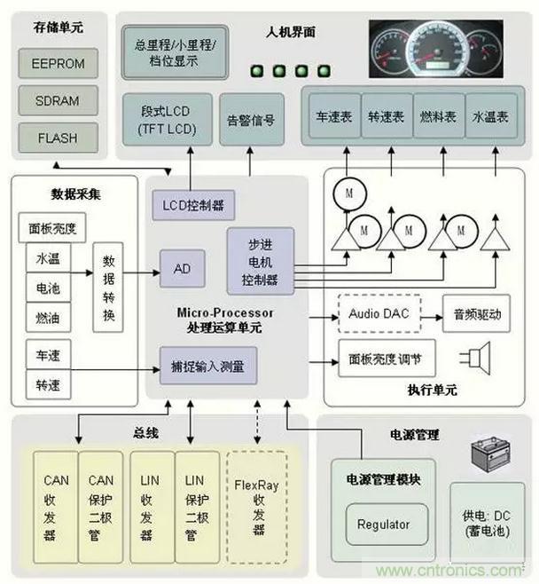 在汽車儀表系統(tǒng)中,各種儀表的傳感器的作用是將發(fā)動機溫度、機油壓力、發(fā)動機轉速、變速器輸出軸轉速、燃油箱油面的高低等物理參量轉換為相應的電壓、電流或電脈沖。并驅動相應的儀表動作,顯示相應的被測量參量。當測量值達到預設的極限值時就會使指示燈報警。