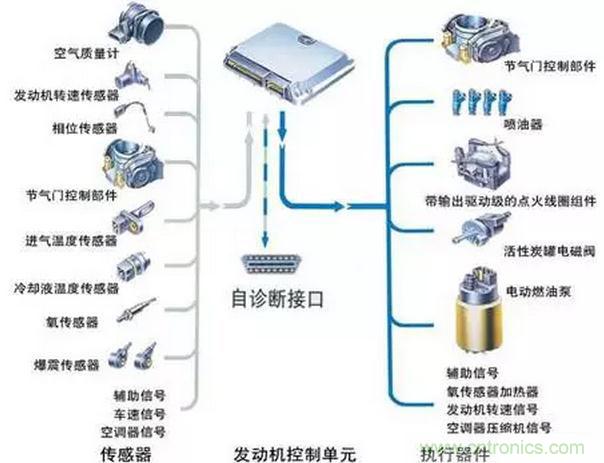 汽車電子控制系統(tǒng)有傳感器、電子控制器(ECU)和執(zhí)行器的組成。在汽車電子控制系統(tǒng)中,傳感器的作用是將被控對象的相關參量轉換為相應的電信號,并輸送給控制器,控制器根據(jù)相關傳感器的信號對被控對象的工況及狀態(tài)進行分析與判斷后,輸出控制信號,通過執(zhí)行器實現(xiàn)自動控制。電子控制系統(tǒng)分為發(fā)動機電子控制系統(tǒng)、底盤電子控制系統(tǒng)和車身電子控制系統(tǒng)。